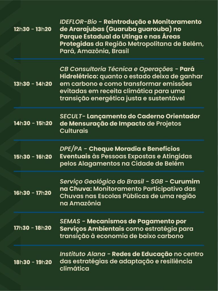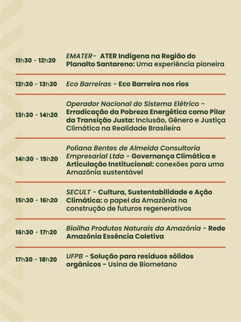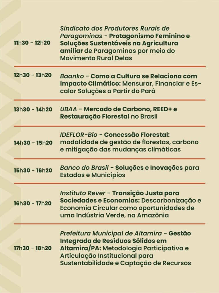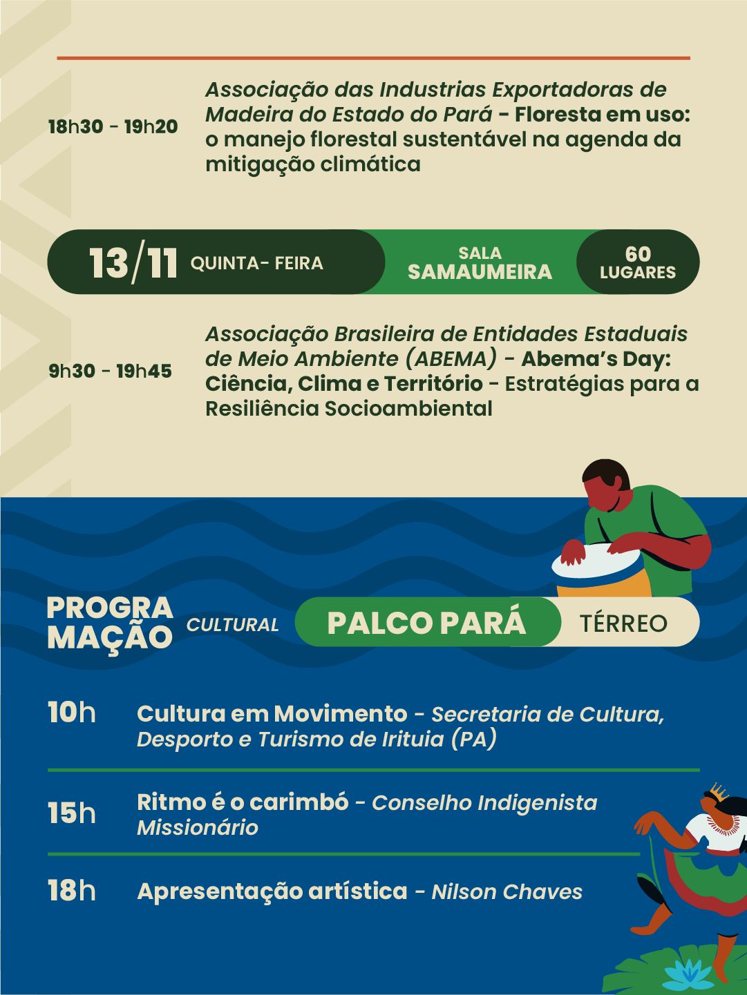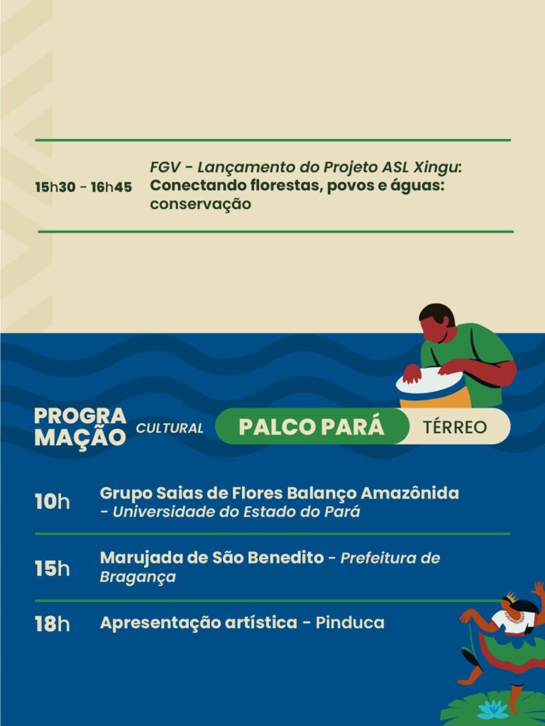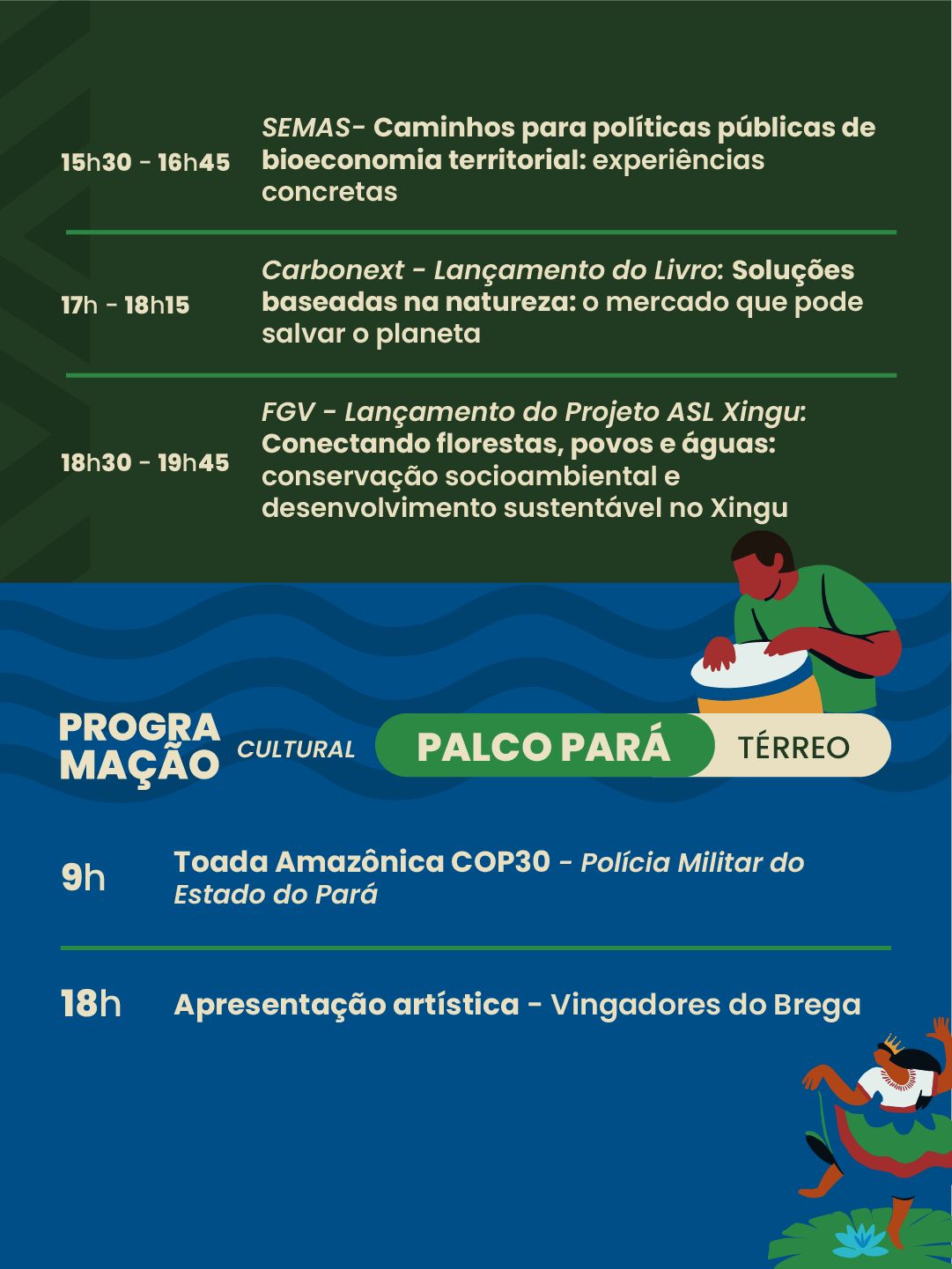 Com programação diária, o Pavilhão Pará pretende aproximar diferentes setores da sociedade – governos locais e subnacionais, setor privado, organizações não governamentais, povos indígenas, quilombolas, comunidades tradicionais, juventudes, academia e sociedade civil em geral – em torno do debate sobre soluções concretas para o enfrentamento da crise climática, a valorização da floresta em pé e a promoção de modelos de desenvolvimento inclusivos e sustentáveis.