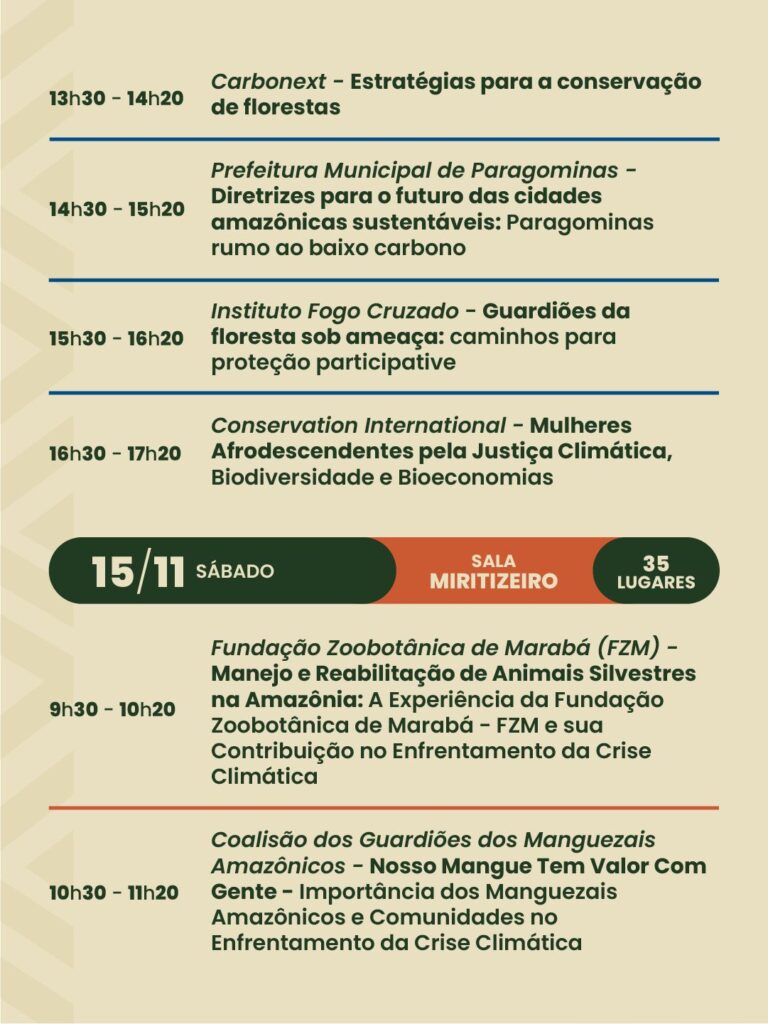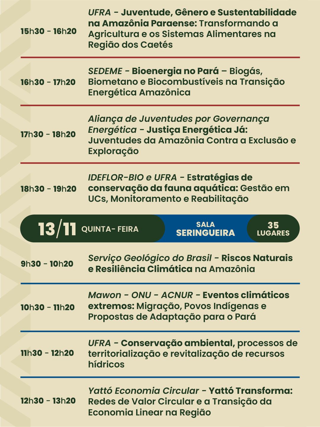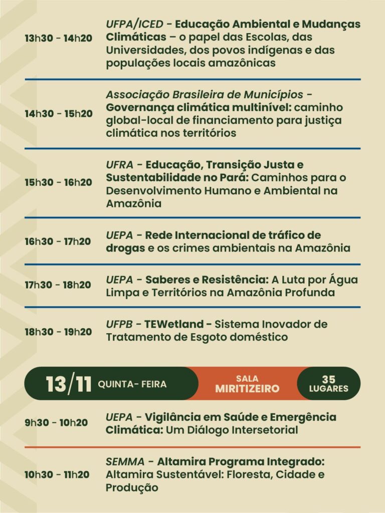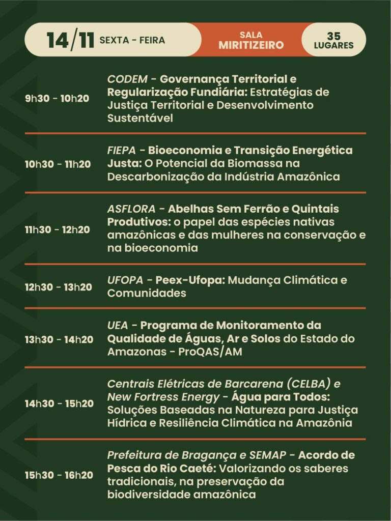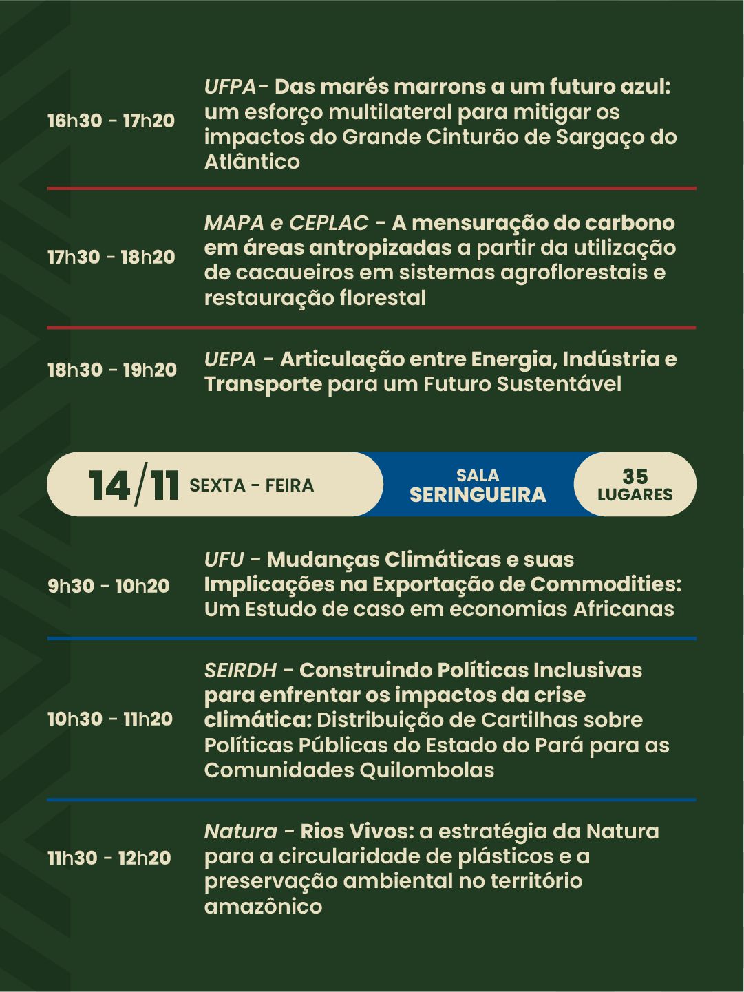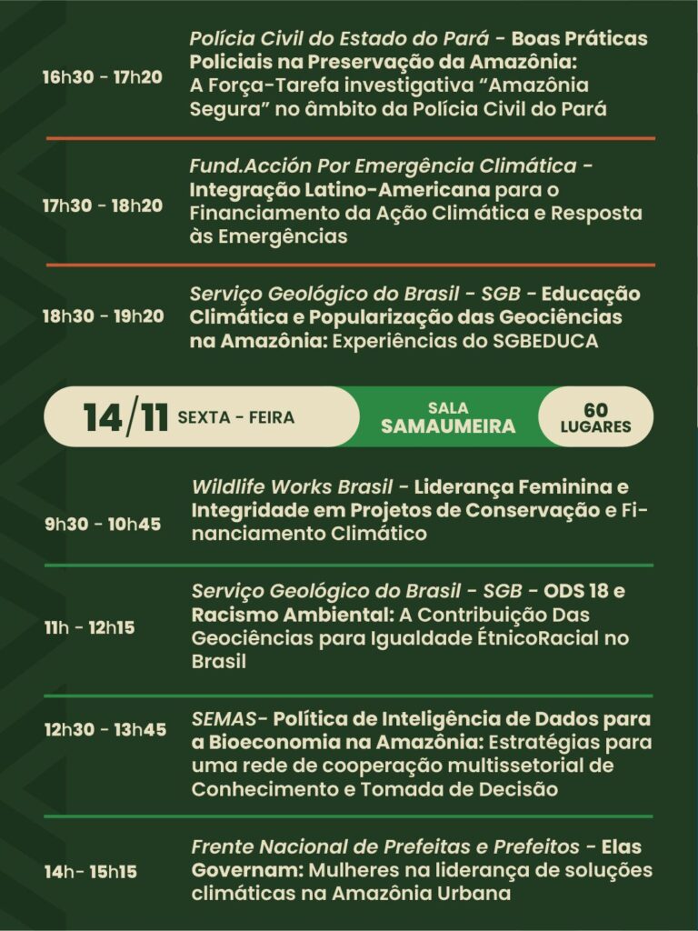 Com programação diária, o Pavilhão Pará pretende aproximar diferentes setores da sociedade – governos locais e subnacionais, setor privado, organizações não governamentais, povos indígenas, quilombolas, comunidades tradicionais, juventudes, academia e sociedade civil em geral – em torno do debate sobre soluções concretas para o enfrentamento da crise climática, a valorização da floresta em pé e a promoção de modelos de desenvolvimento inclusivos e sustentáveis.