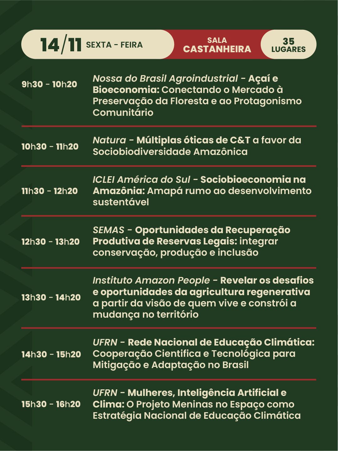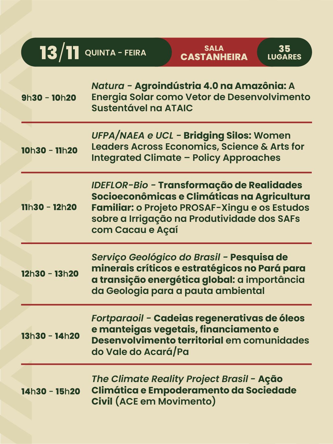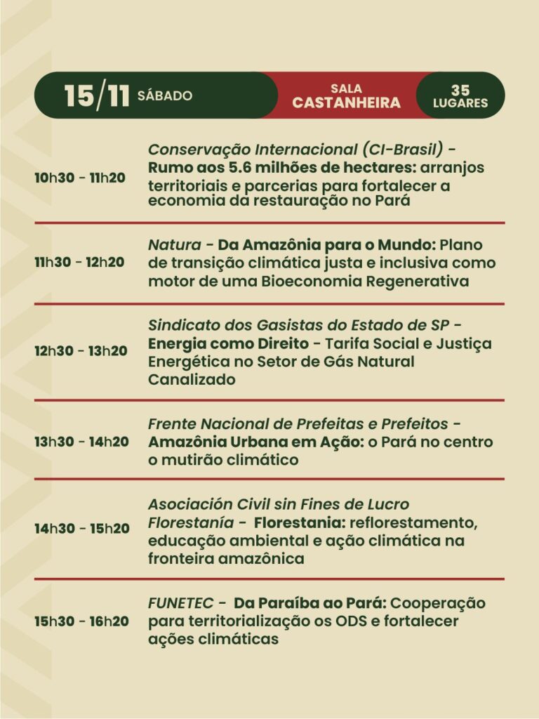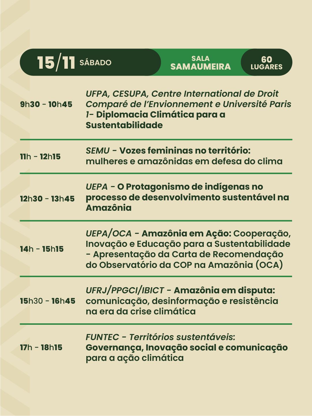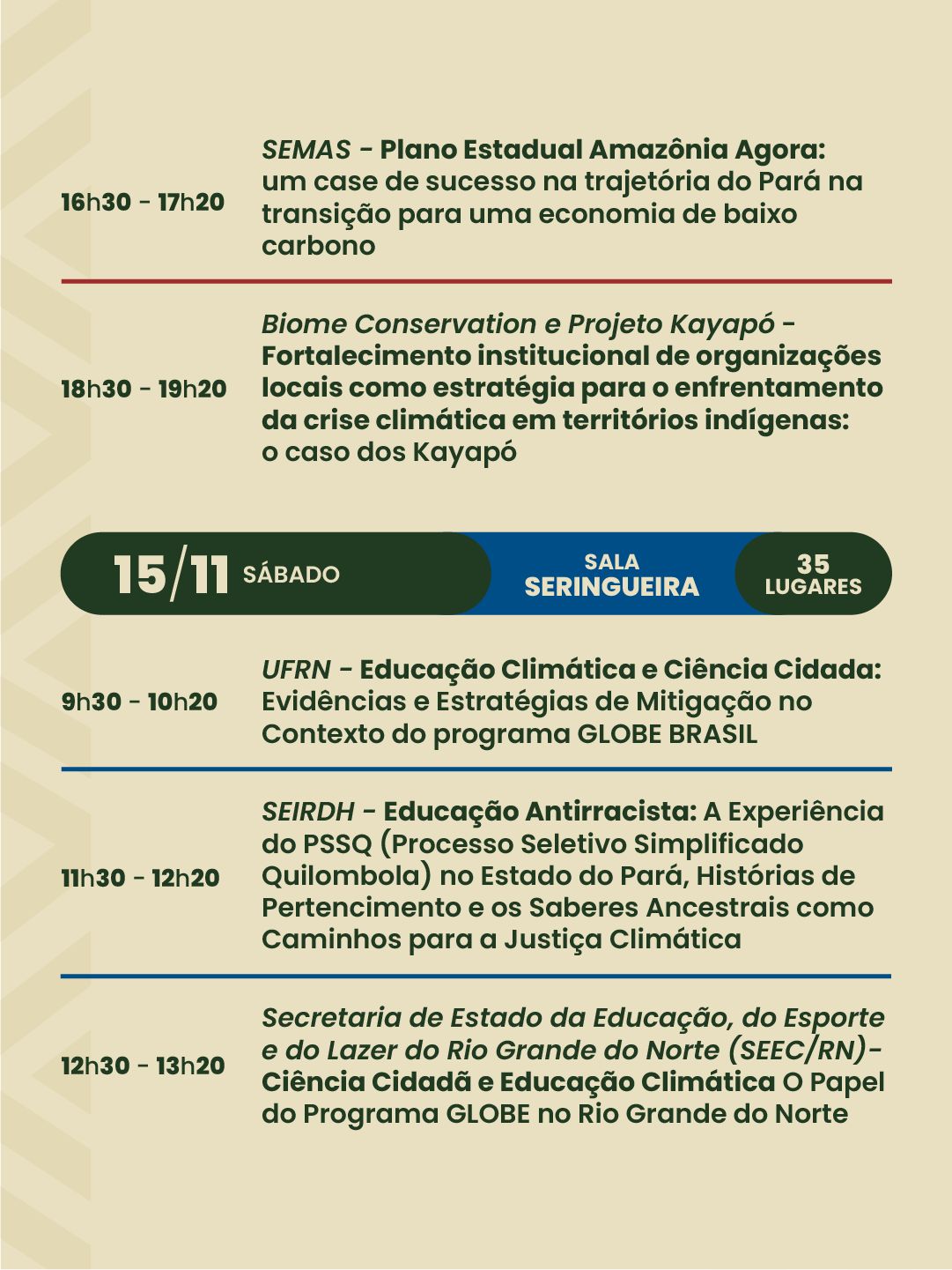Com programação diária, o Pavilhão Pará pretende aproximar diferentes setores da sociedade – governos locais e subnacionais, setor privado, organizações não governamentais, povos indígenas, quilombolas, comunidades tradicionais, juventudes, academia e sociedade civil em geral – em torno do debate sobre soluções concretas para o enfrentamento da crise climática, a valorização da floresta em pé e a promoção de modelos de desenvolvimento inclusivos e sustentáveis.